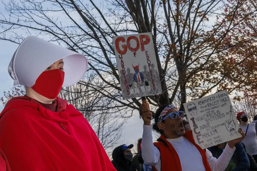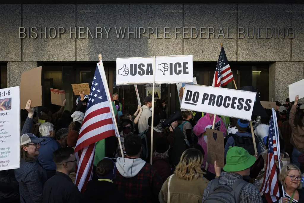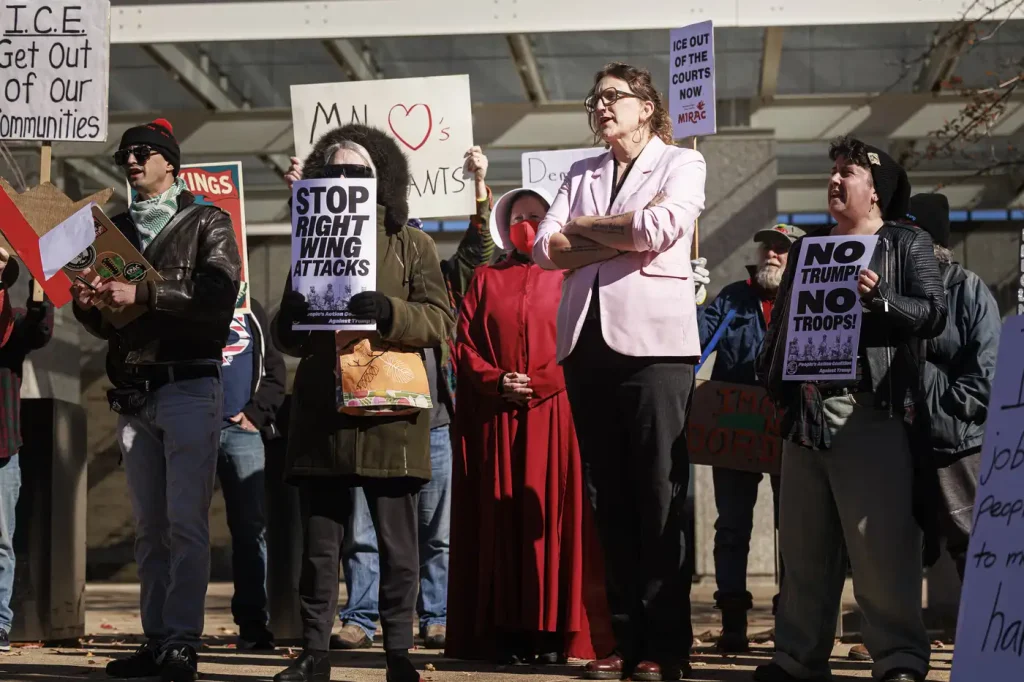 Before Noem spoke, hundreds of demonstrators gathered outside Fort Snelling’s Bishop Whipple Building. Dozens of interfaith leaders were present, and they began with a prayer.